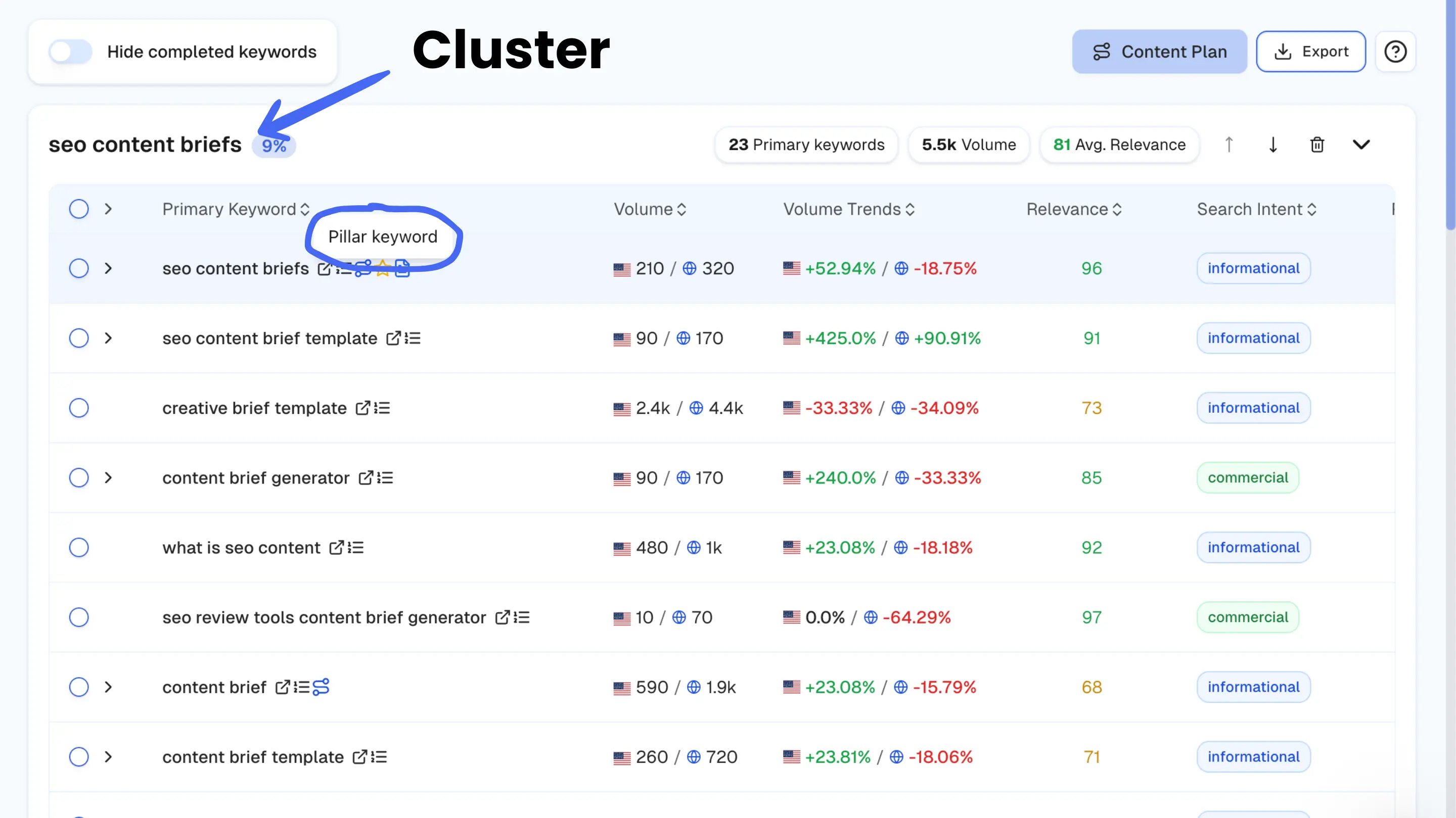 Once you’ve mapped out the main topic clusters for your niche, decide which group to target first and pick one keyword from that cluster to start your brief. Preferably you should start from the pillar keyword a.k.a the broad, high-level keyword that covers the core idea of your niche.