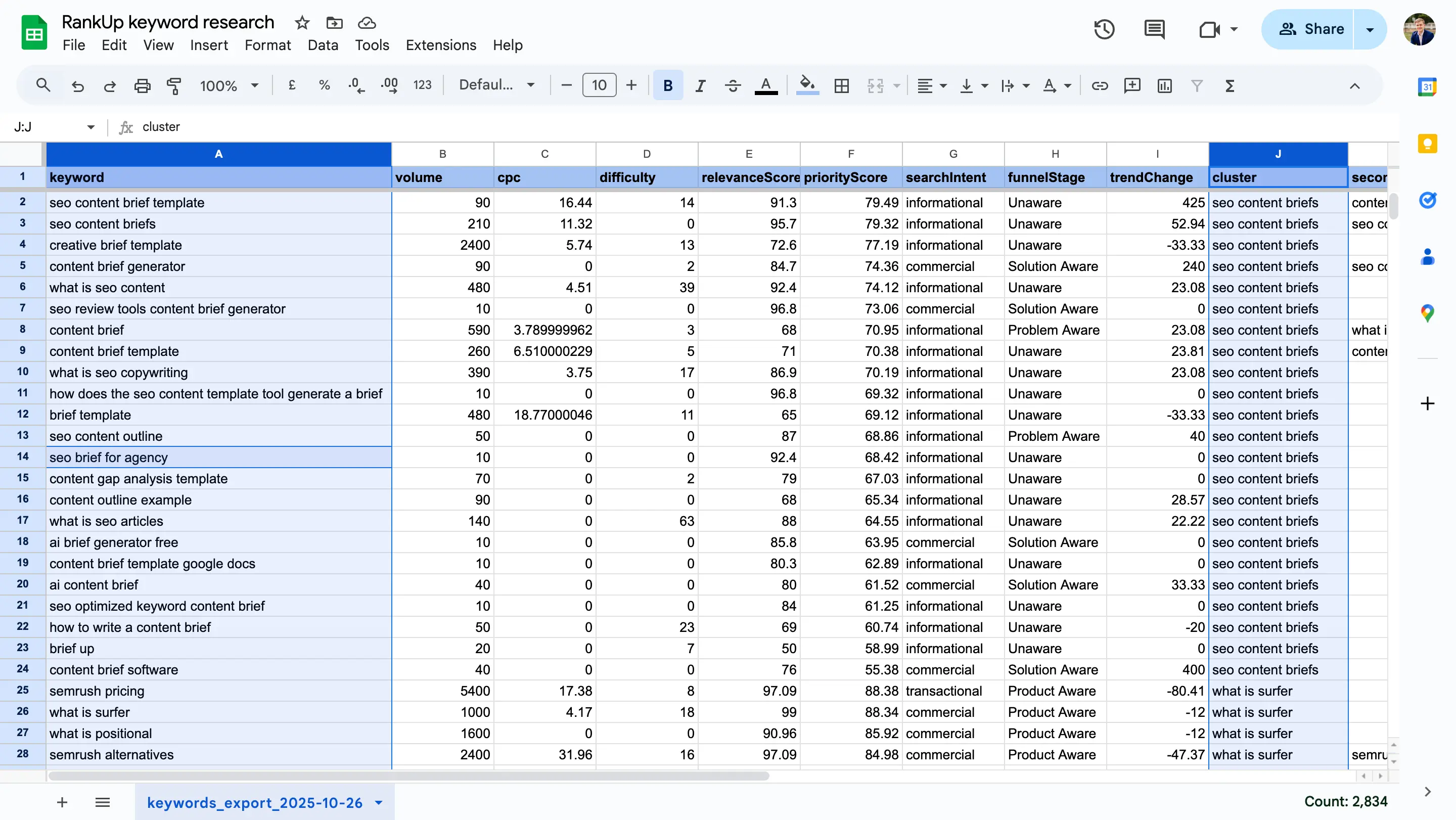 Collect all relevant keywords in your spreadsheet, paying attention to metrics like search volume and keyword difficulty, but always prioritize relevance.
