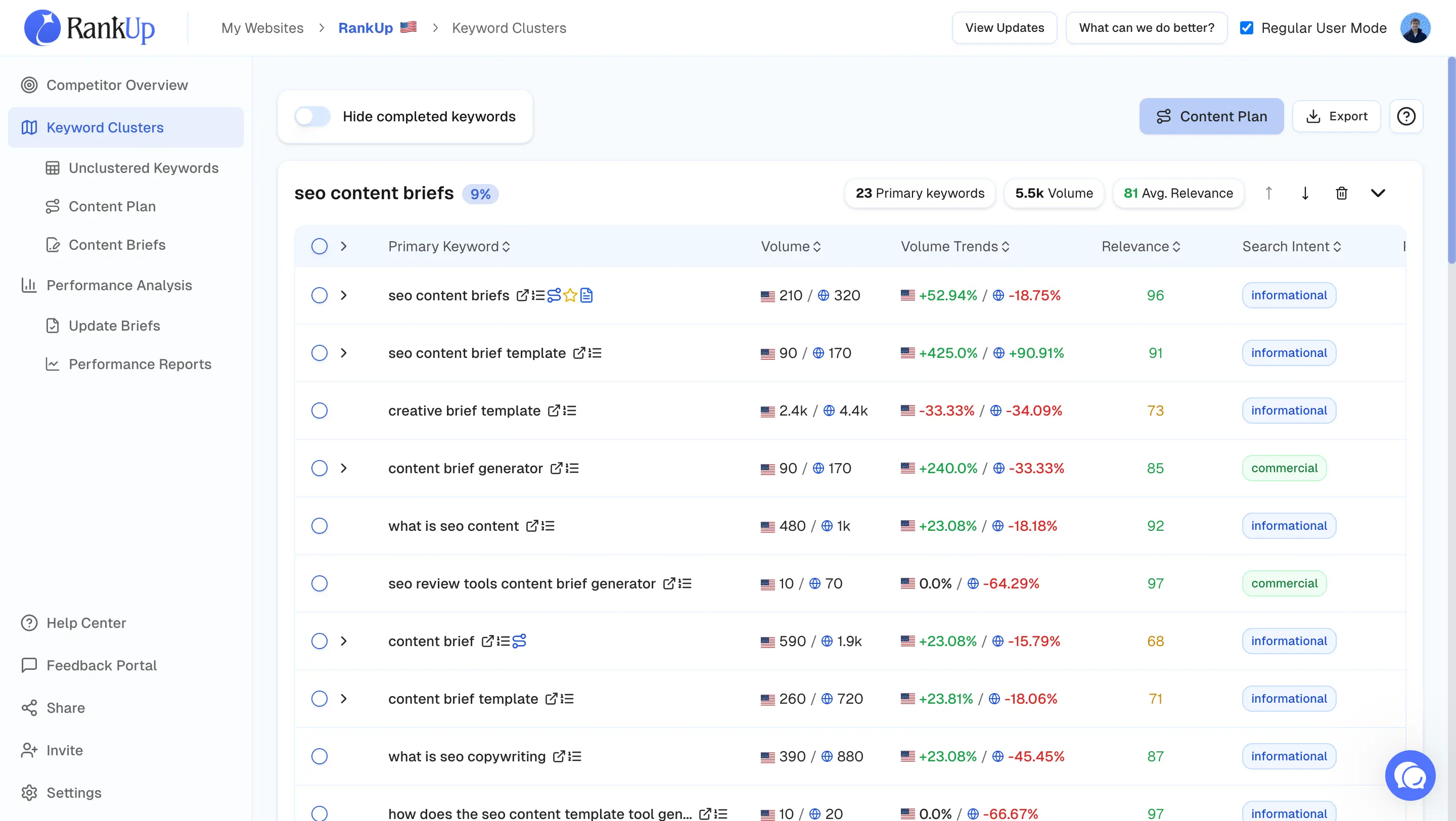 Now RankUp already did all the foundational keyword research for me, so I just have to choose the next topic from the keyword clusters and generate a content brief for it.