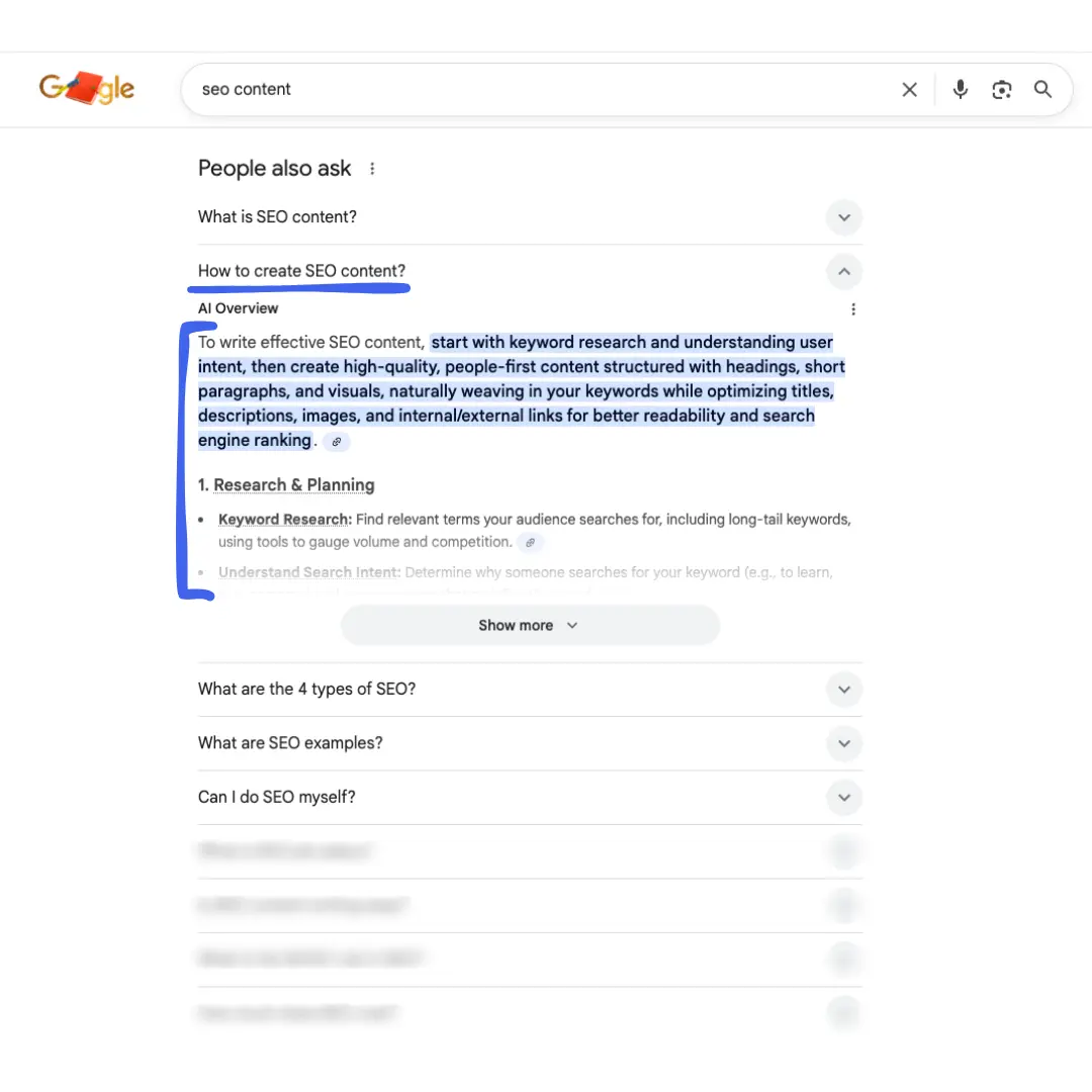 Mirror the heading - If your heading is a question, like for example "What is SEO content?", start with "SEO content is..." Use the same 2-3 word chunk from the heading in your answer