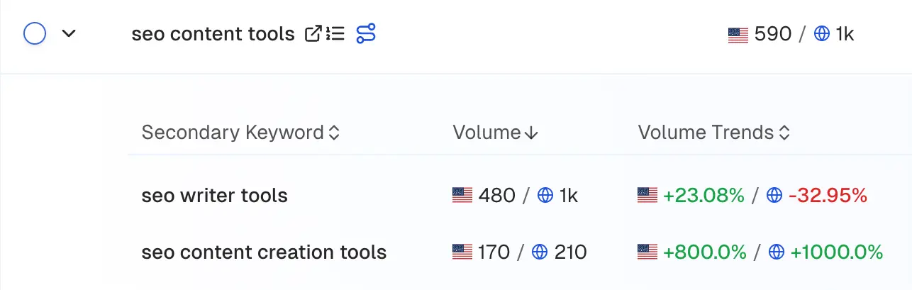 For keyword validation, insert your brainstormed keywords into any SEO tool that shows search volume, difficulty, trend, and other such keyword data.