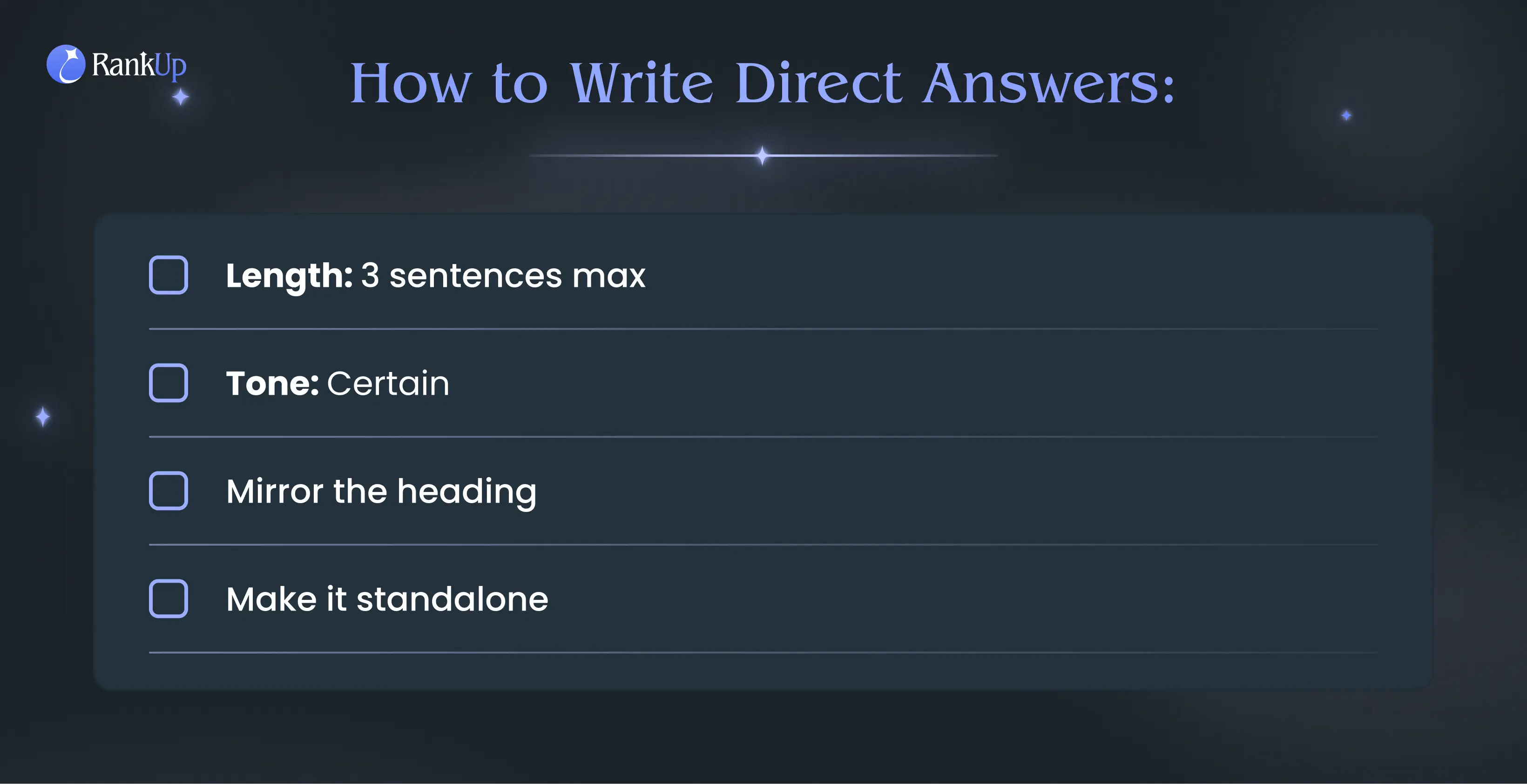 Use a certain tone - Avoid uncertain phrases like "might," "could be," or "try to." Sound confident so search engines and LLMs trust you're addressing the main point