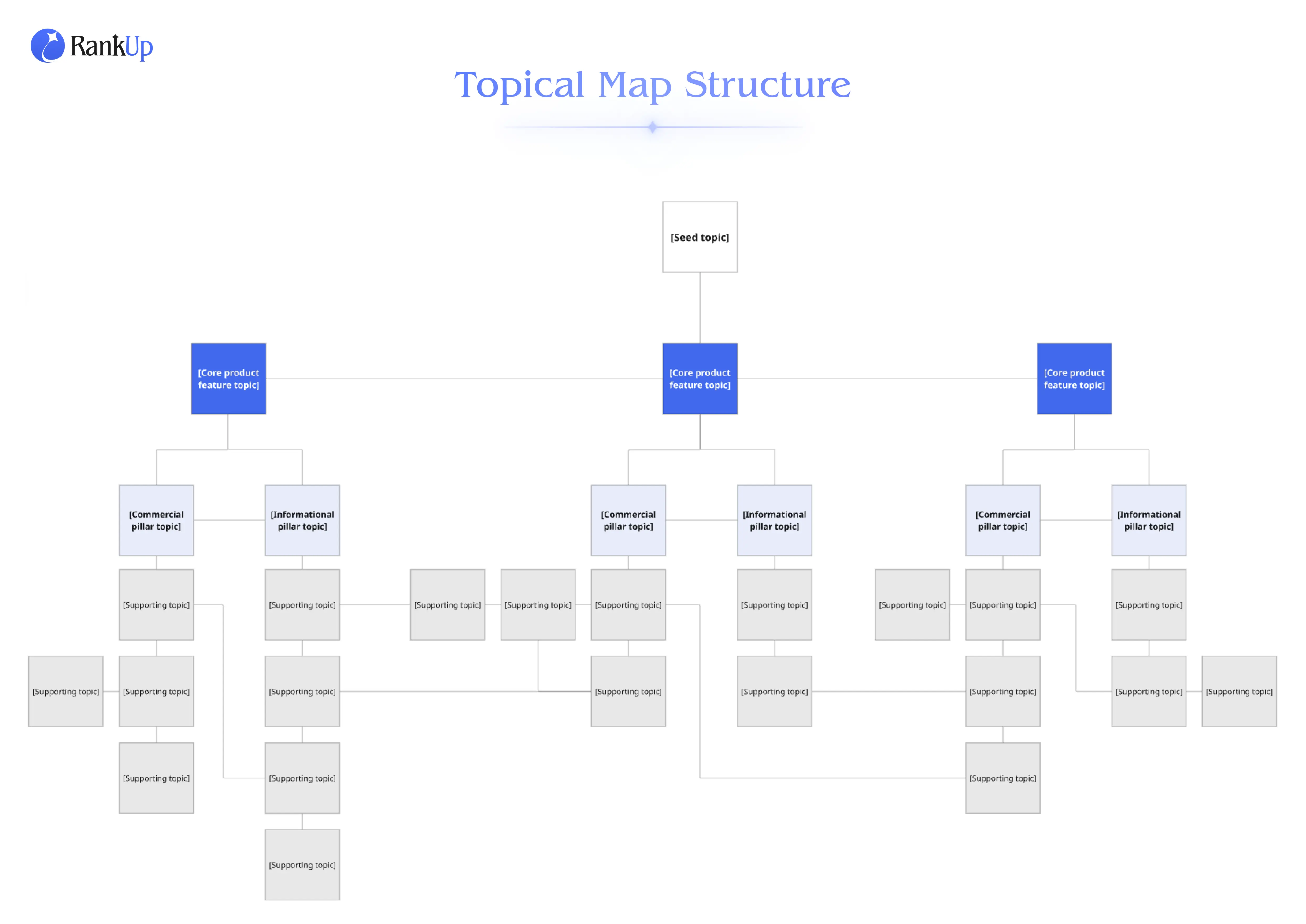 A topical map is a structured content roadmap that connects your keyword clusters. It shows what order to write and publish your topics in, and helps you visualize how each piece should connect to others, so you avoid having pages on your site that don't pass authority and guide visitors through your site.