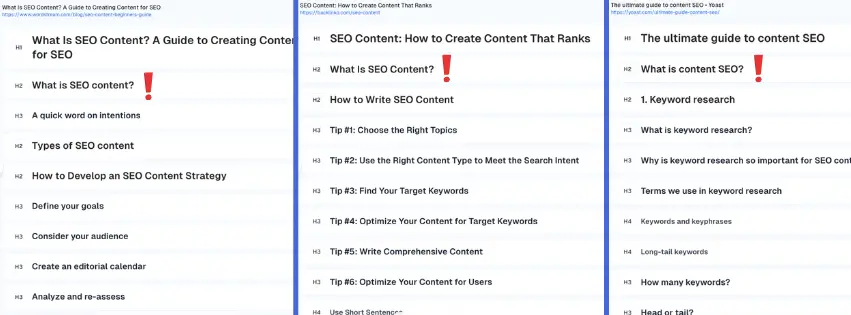 How is their content structured? Note down their H2/H3 headings, the order of sections, and which topics they prioritize early vs. later in the article.