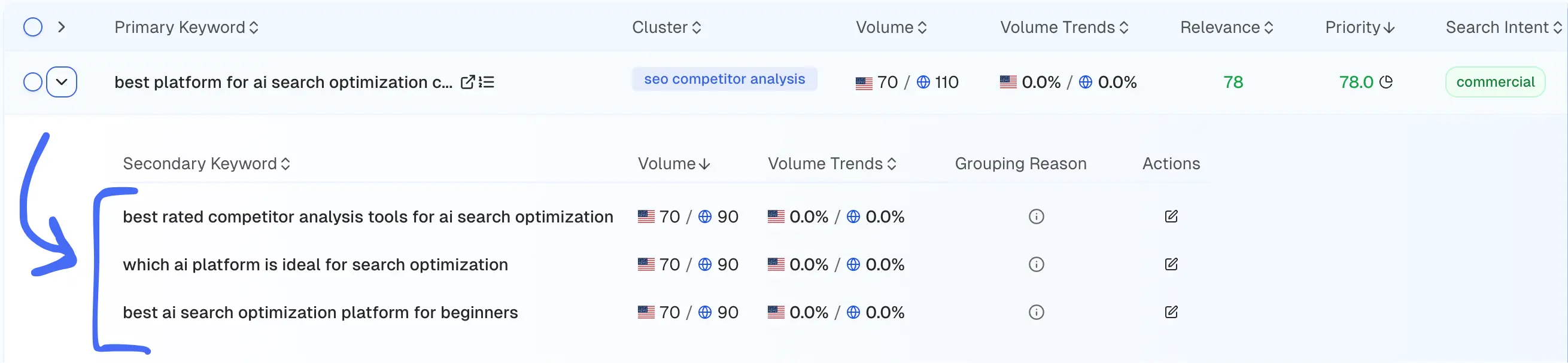 A primary keyword is the main search term that defines what your content is about, while secondary keywords are related phrases that support and expand on that topic. Together, they help your content rank for a broader range of searches and show search engines that your page provides comprehensive coverage of a subject.