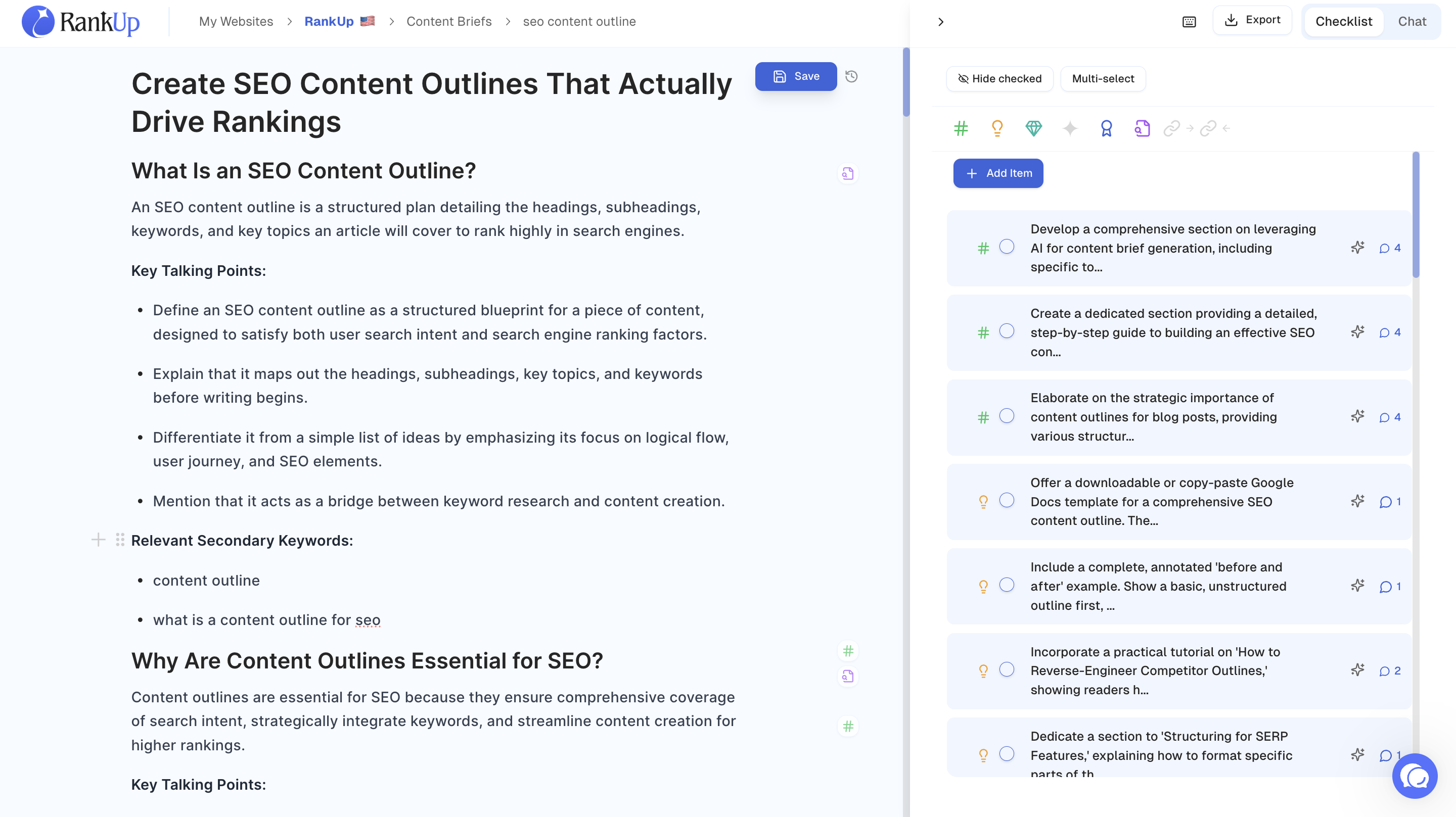 RankUp is an AI-powered SEO platform that automates the entire SEO content creation workflow, from keyword research to brief generation and first drafts. It’s the smarter way to create content briefs because it eliminates guesswork, saves hours of manual work, and ensures every piece of content is built to rank.