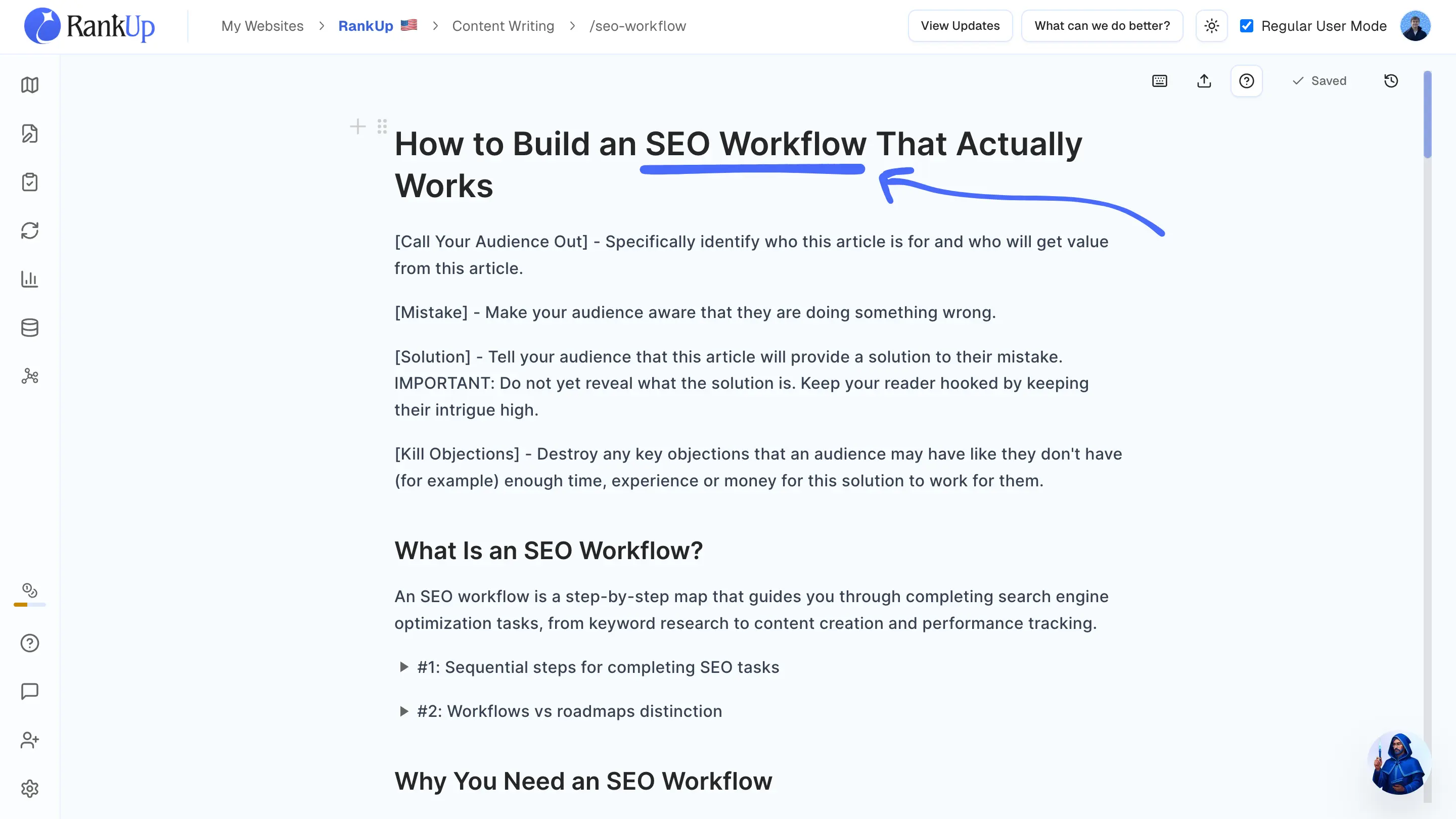 Instead of creating a document, RankUp generates an outline with direct answers and key talking points under each section, where key elements like the unique angle, competitor insights, and topic research are already baked in.