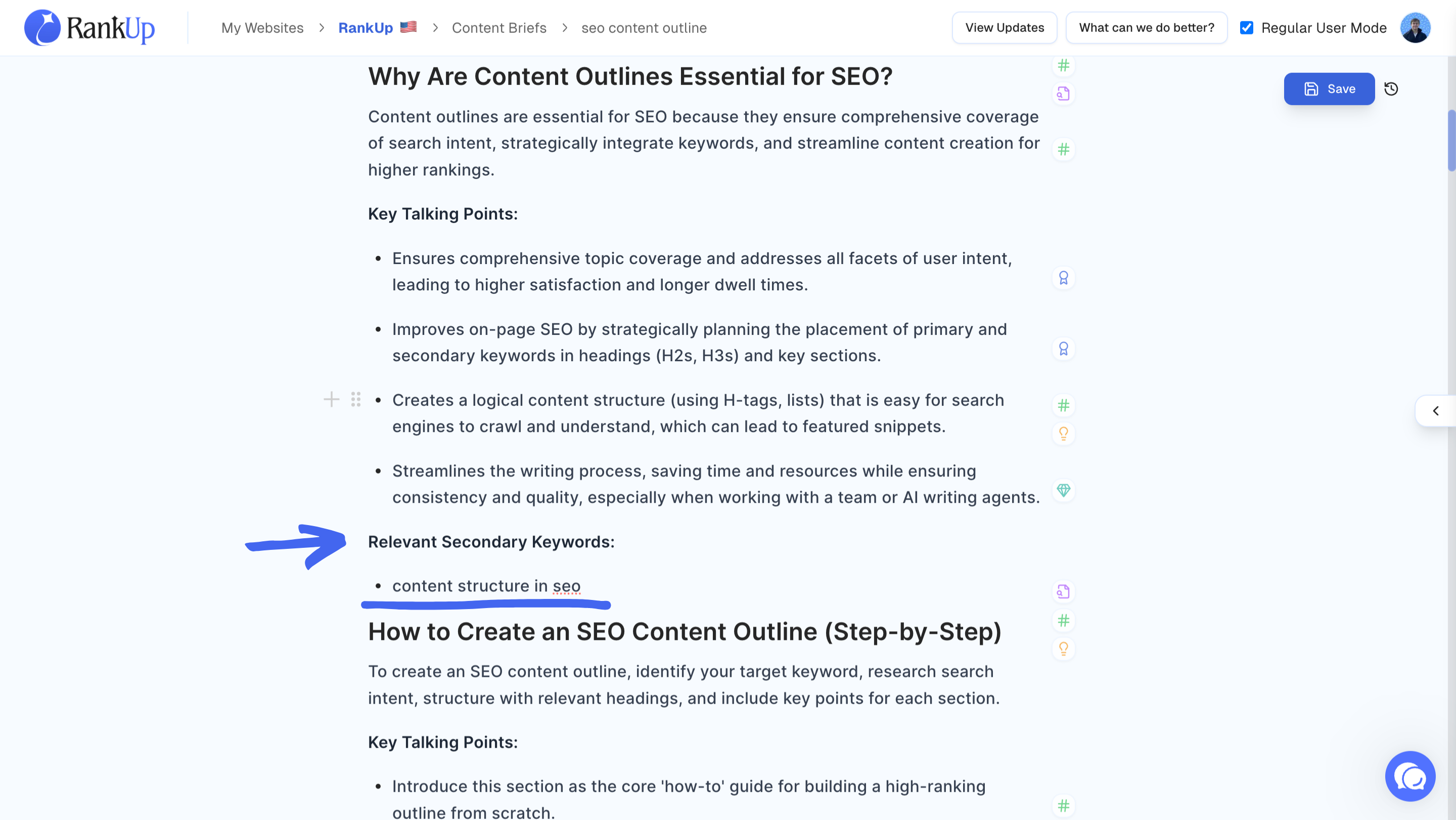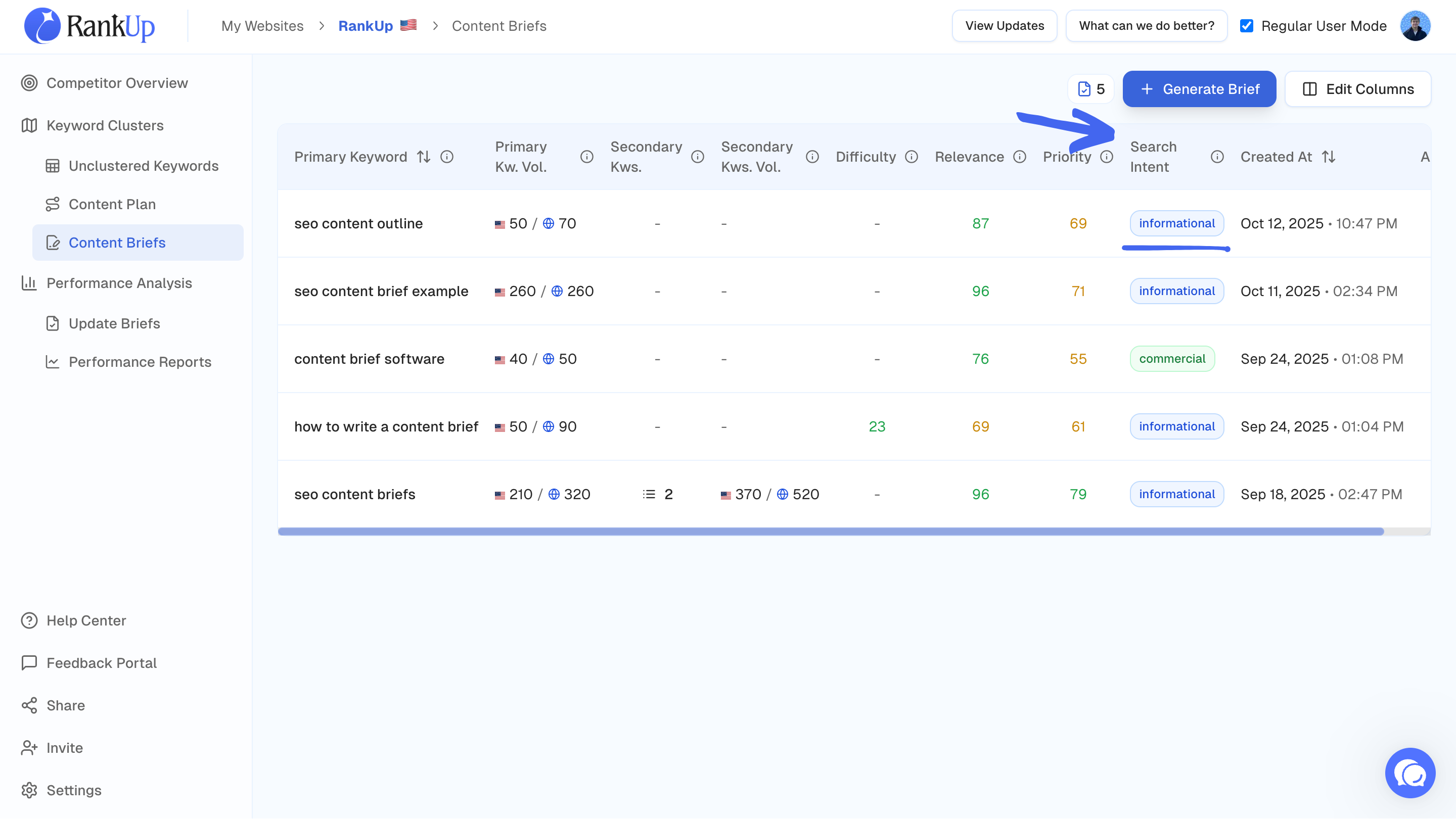 Complete Brief Generation (Single or Bulk) - Building briefs manually can take hours per piece. RankUp creates detailed, SEO-ready briefs in minutes, complete with everything you need, so you can move from research to writing instantly.