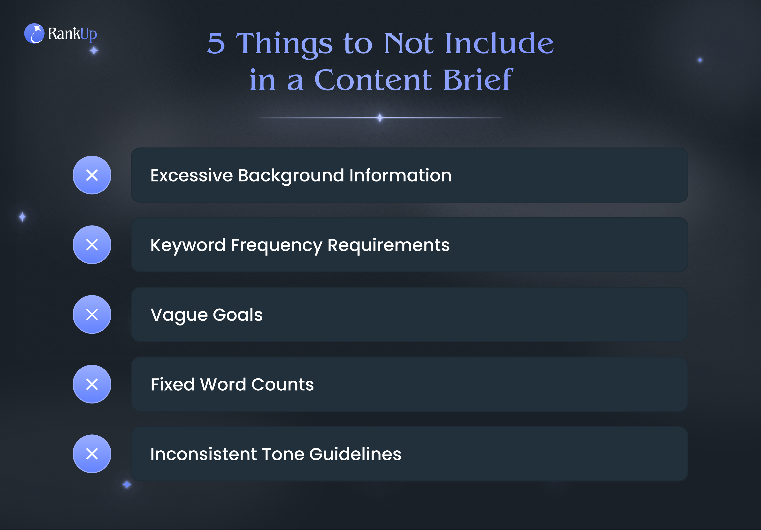 A well-crafted content brief should not include excessive brand background, rigid keyword frequency rules, vague goals, fixed word counts, or conflicting tone instructions. These items confuse writers, waste time, and weaken the content’s chance to rank or convert.