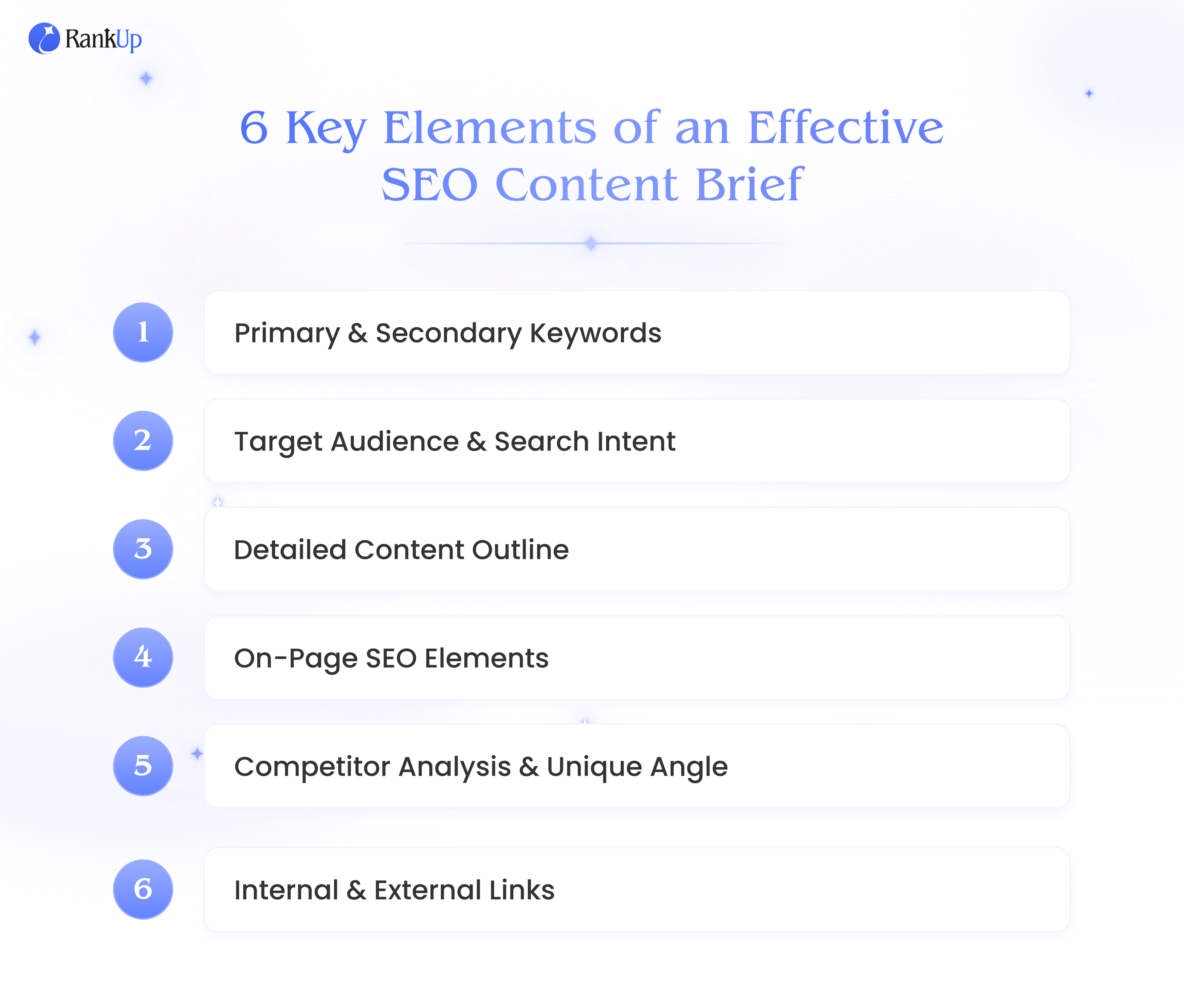 An effective SEO content brief includes target keywords, audience and search intent, a clear content outline, on-page SEO details, competitor analysis and unique angle suggestions, and internal/external link suggestions. Each element ensures that content is optimized for both readers and search engines while keeping writers aligned with the strategy.