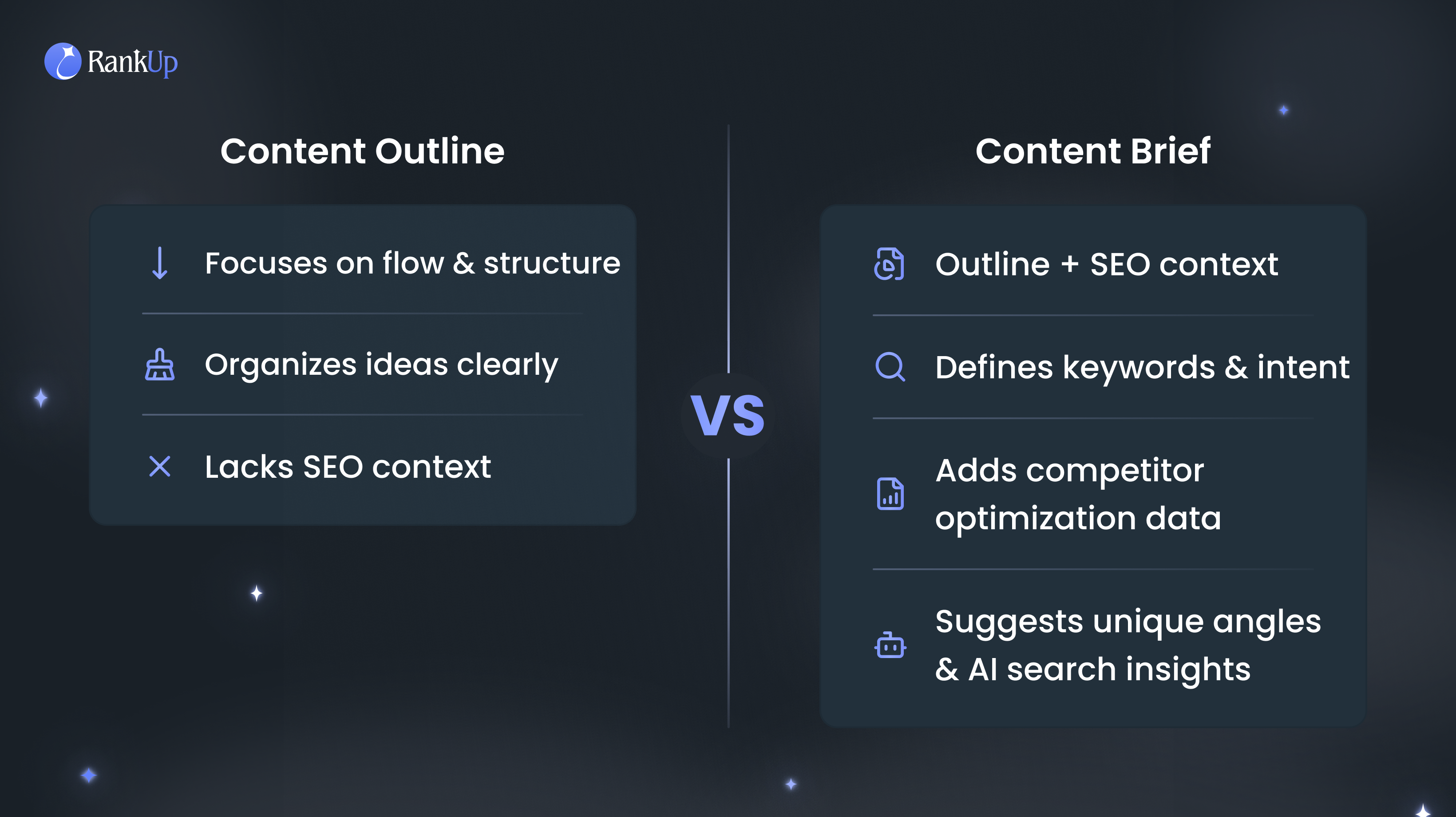 A content brief is different from a content outline because it combines structure and strategy, giving writers not just what to write, but how to make it rank.
