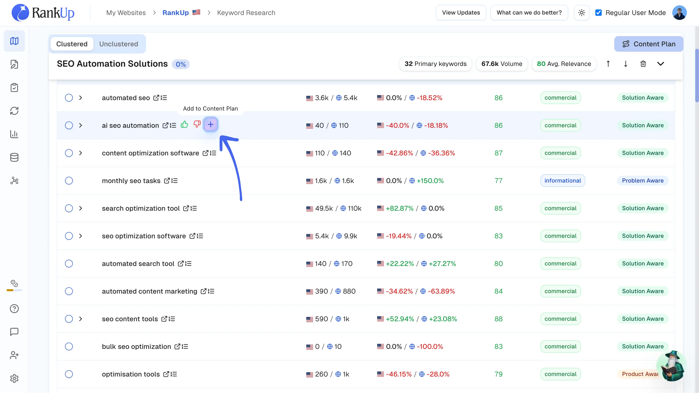 Once you’ve chosen your topic, add it to your content plan (if Magnus didn't do it for you already) by clicking the plus (+) button next to the "downvote keyword" icon when you hover over the keyword, and then move on to the next step.