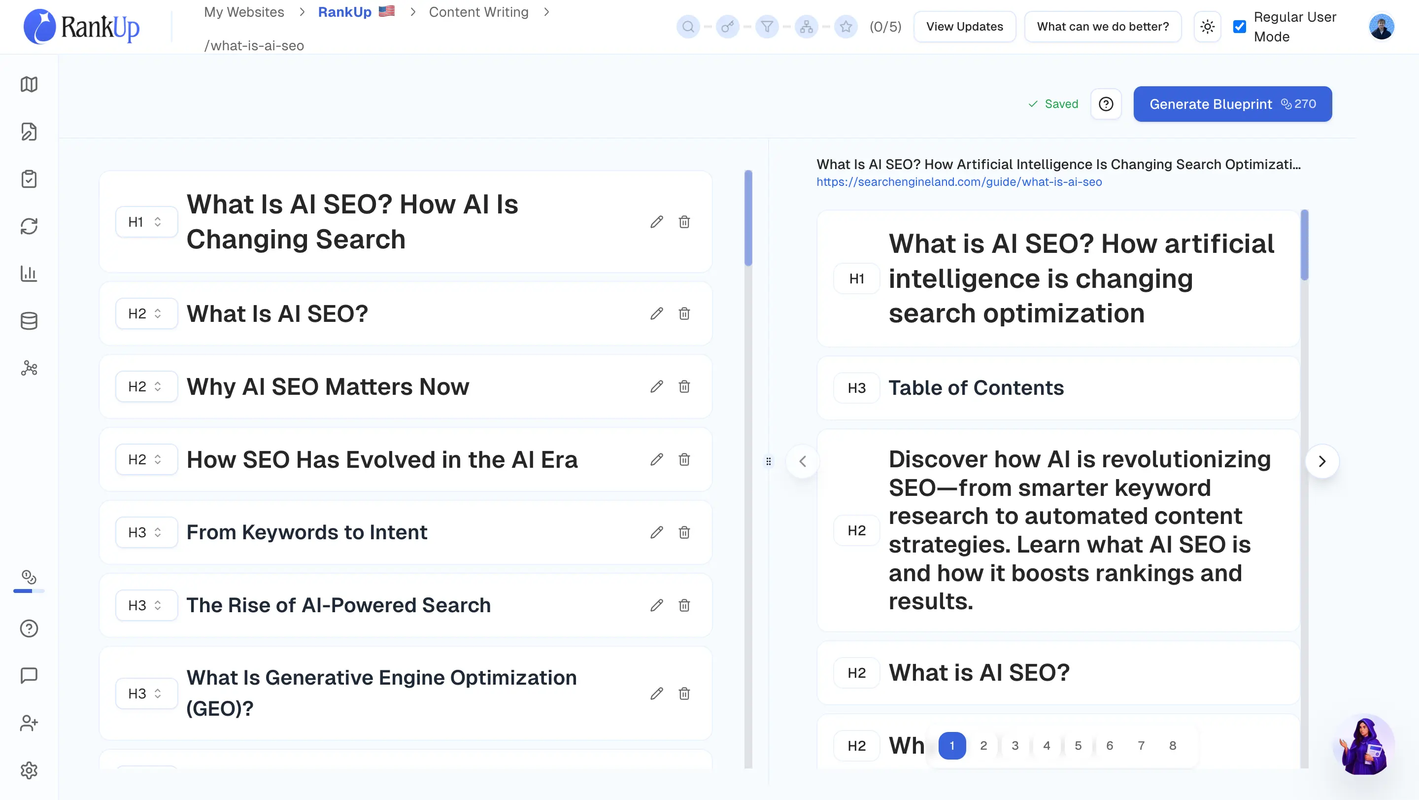 We’ve seen that using content outlines cuts RankUp users’ writing time by at least 50%, usually even more, since you’re not building structure as you go. With an outline set, you know exactly what to cover and in what order, which means fewer rewrites and faster content production.