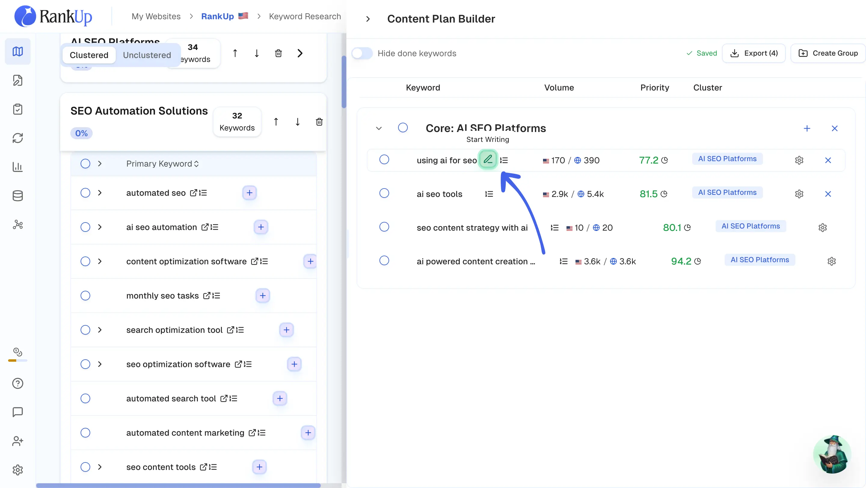 If you’ve already used RankUp’s SEO strategist agent, Magnus, to do your keyword research, selected your target cluster, identified the next topic to work on, and added it to your content plan, you can skip straight to Step 2.